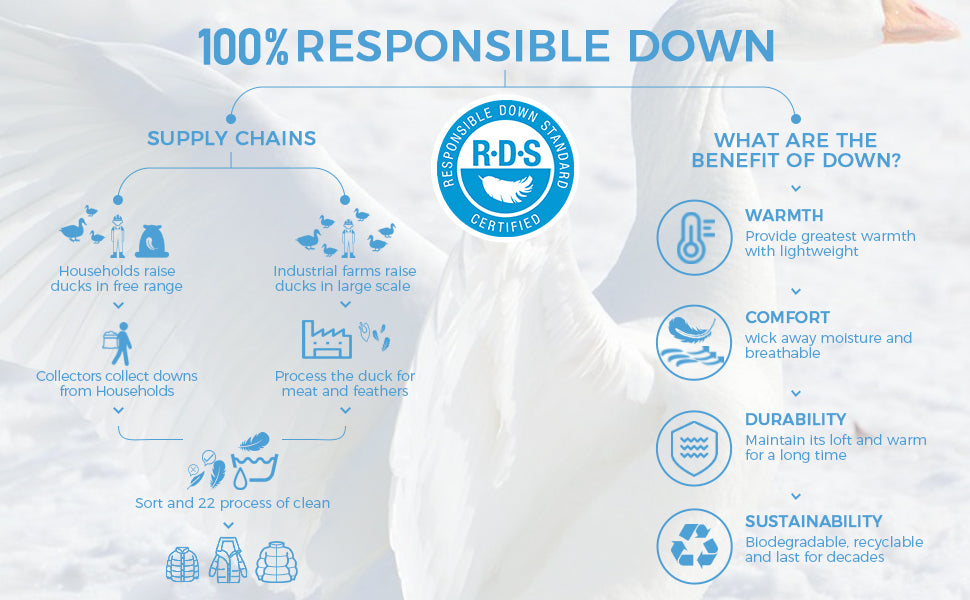 At Wantdo, down feathers are sourced from trusted suppliers that have been audited for compliance with the RDS (Responsible Down Standard), which ensures the feather comes from animals that are not subjected undue harm or mistreatment.