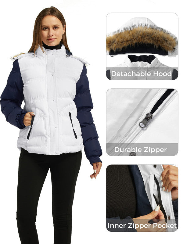 This puffy jackets for women performs well against mild wind, snow, and cold. The adjustable and detachable hood effectively prevents gusts of cold winds. The hood of the zipper-up jacket also can be removed for those not-so-cold winter days.