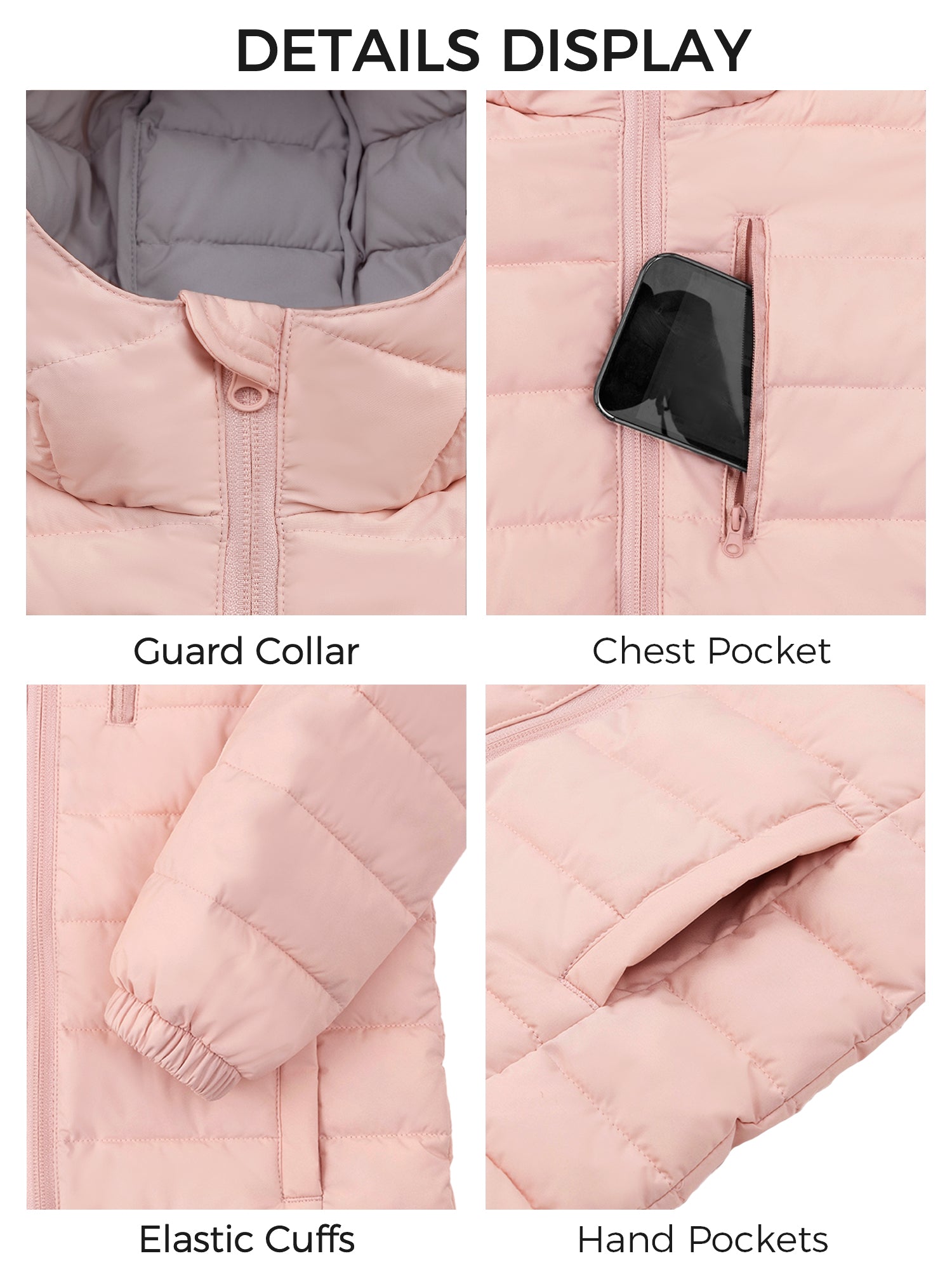 Functional pockets: The winter jacket for girls features 2 hand pockets and 1 chest pocket that provide ample space to store essentials. Moreover, these hand pockets of this girl's puffer jacket provide a cozy refuge when the chill sets in.