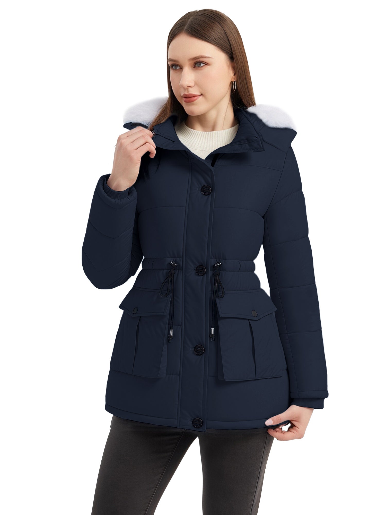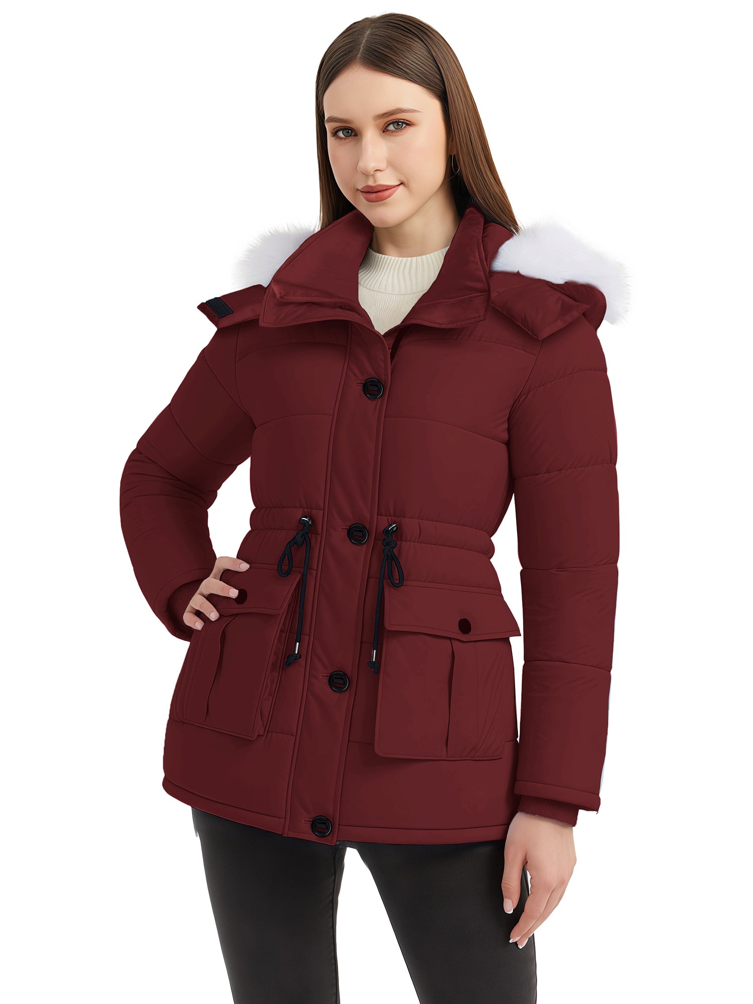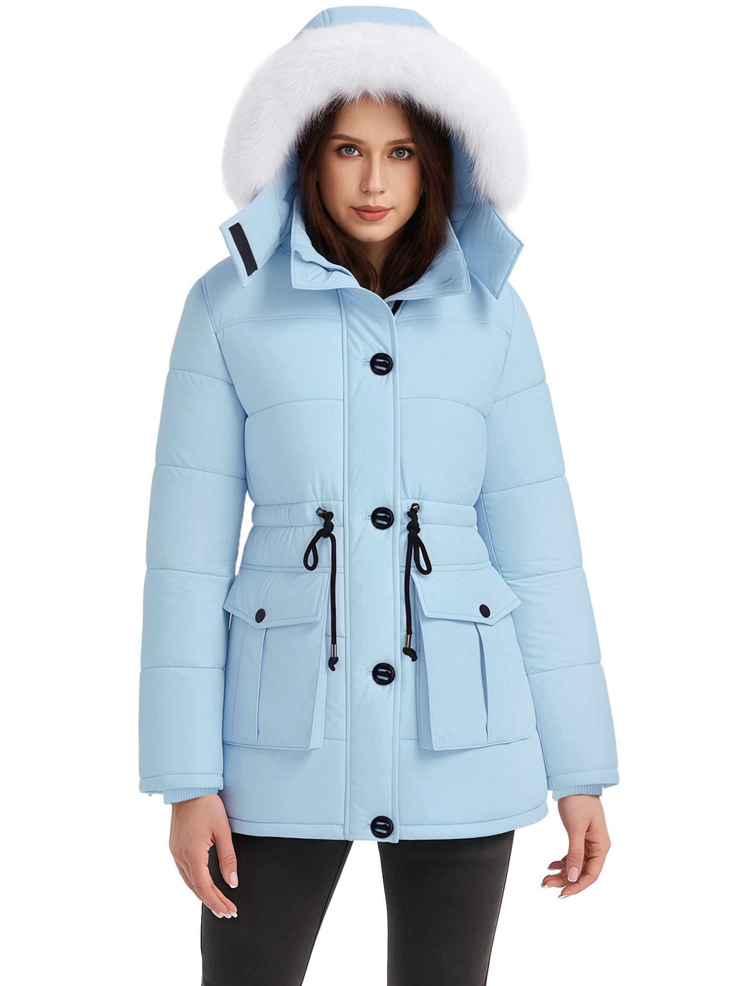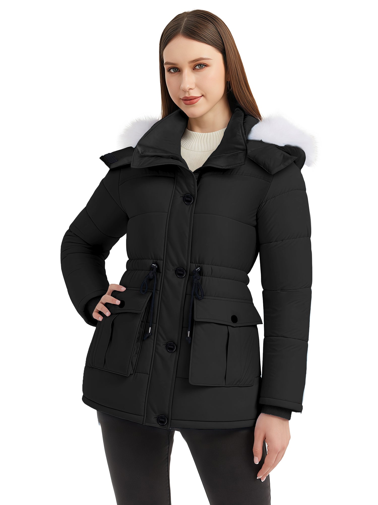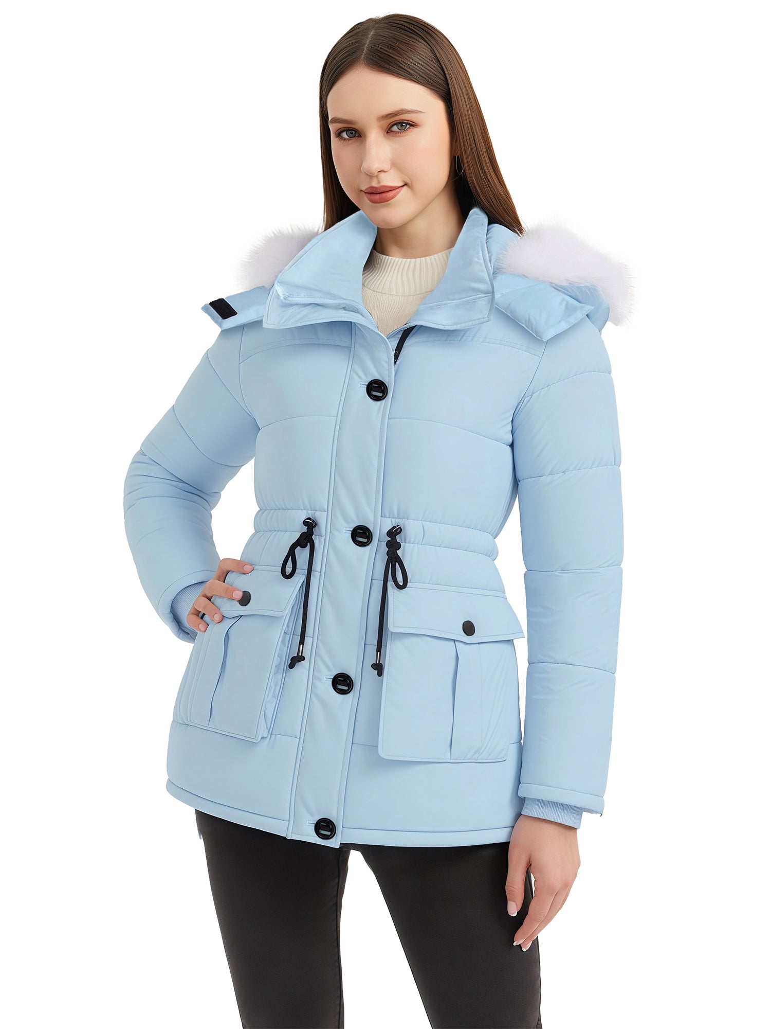 Stylish Choices: Featuring a waist drawstring, this parka jacket for women allows for flexible adjustment of the fit, creating a flattering appearance. Besides, this women's winter parka coat is equipped with a high collar.