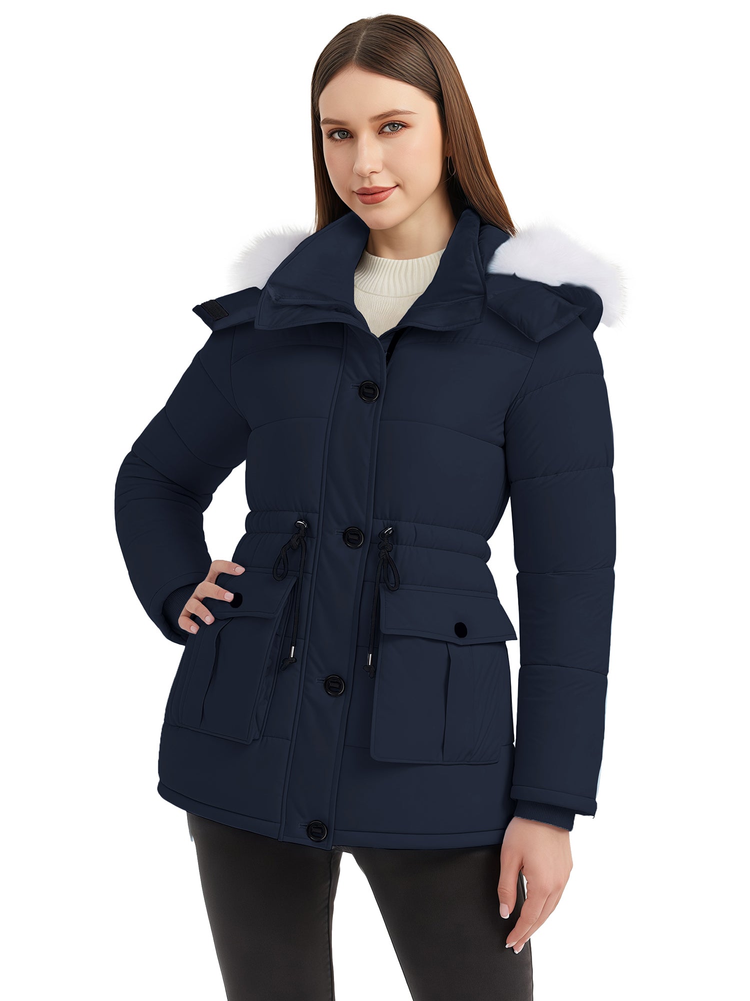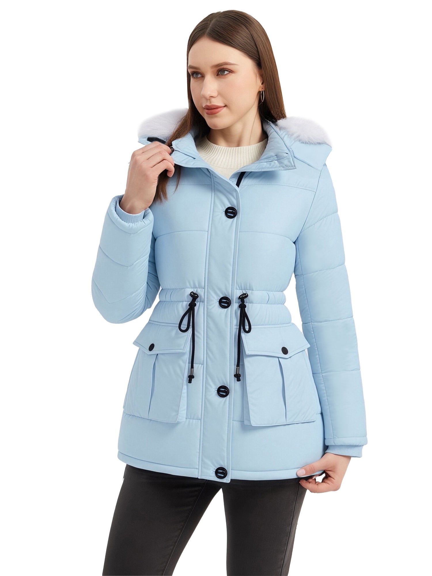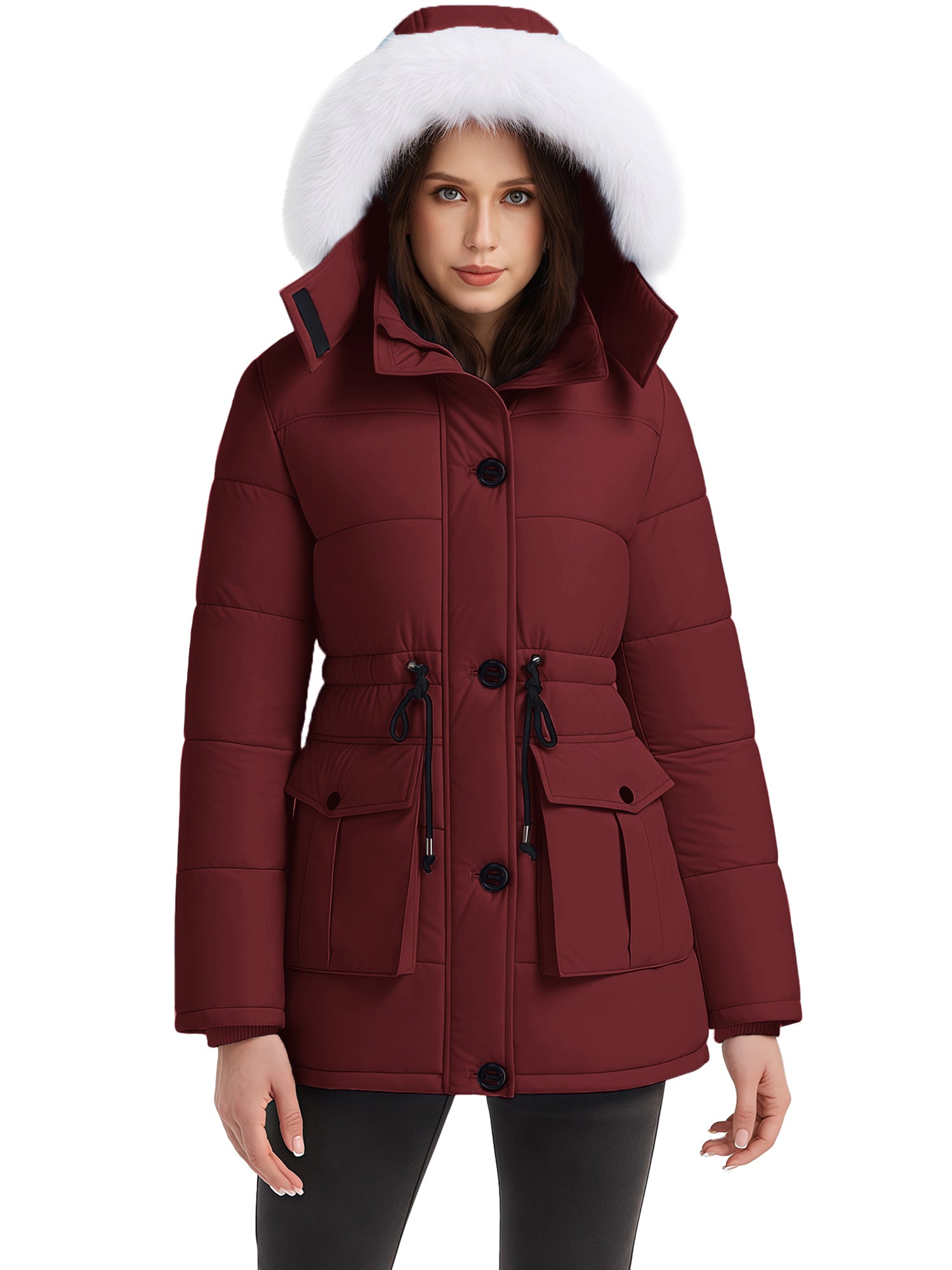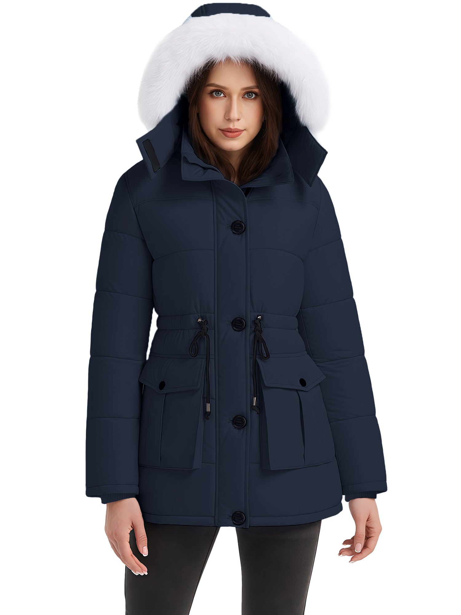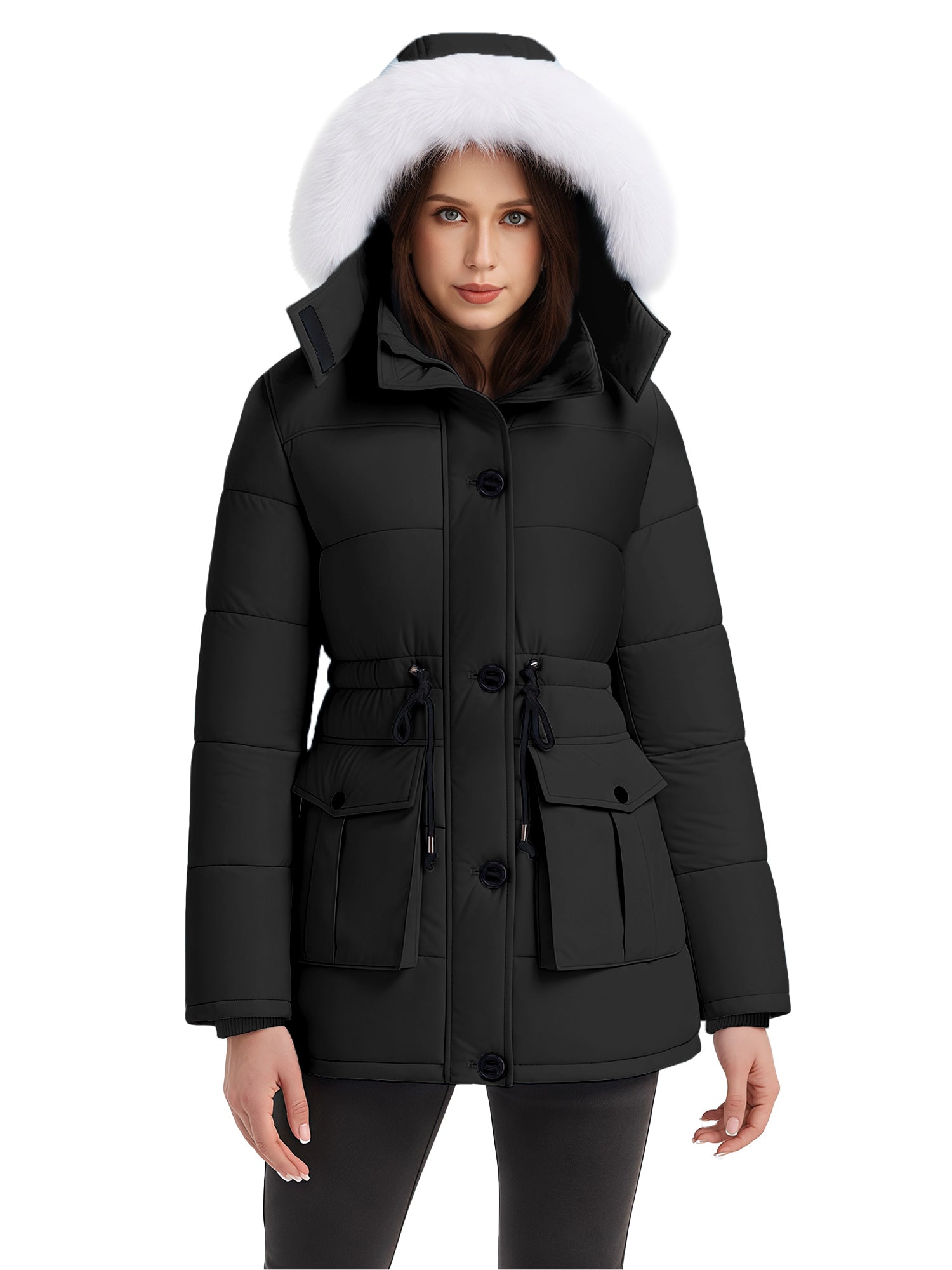 Stylish Choices: Featuring a waist drawstring, this parka jacket for women allows for flexible adjustment of the fit, creating a flattering appearance. Besides, this women's winter parka coat is equipped with a high collar.