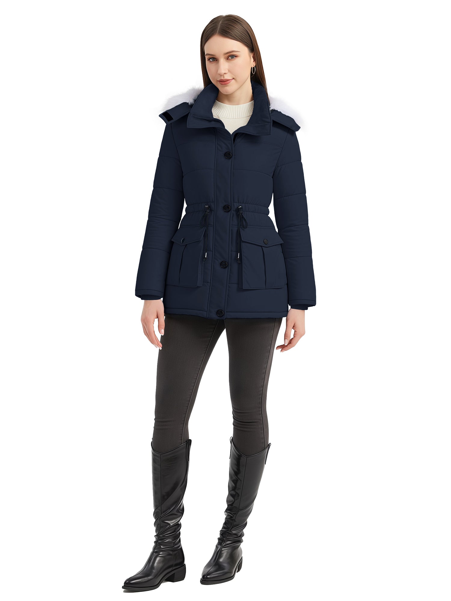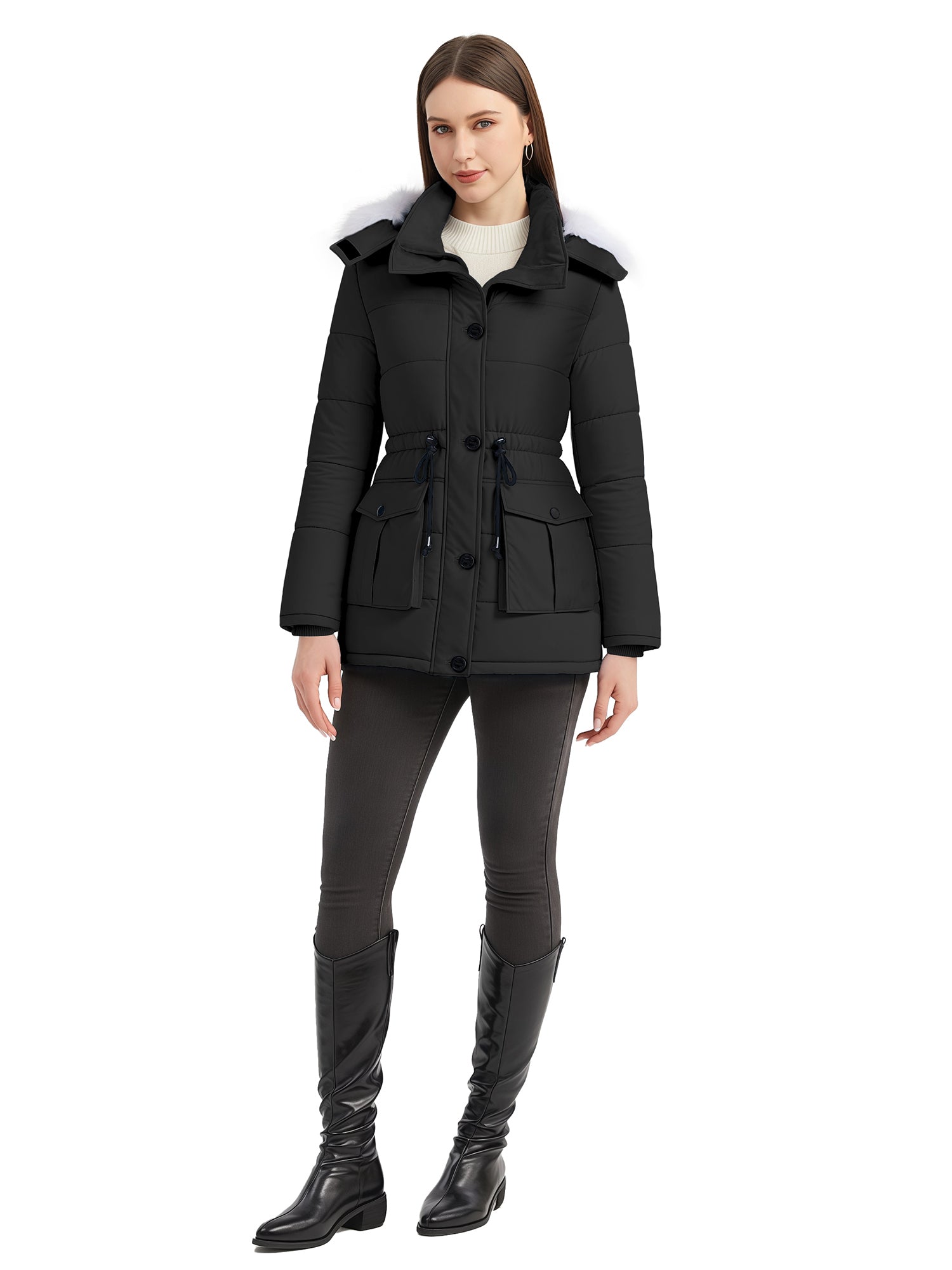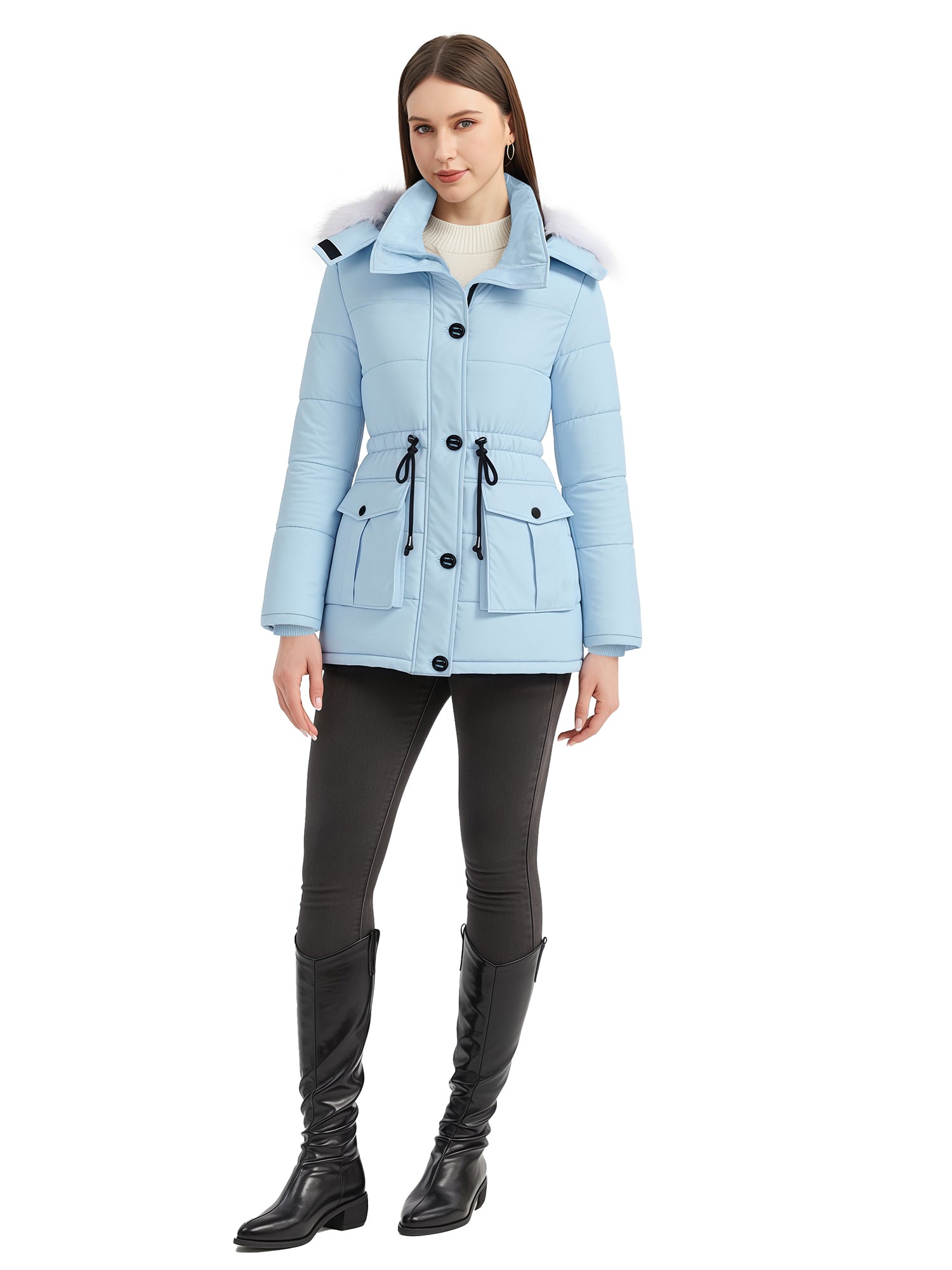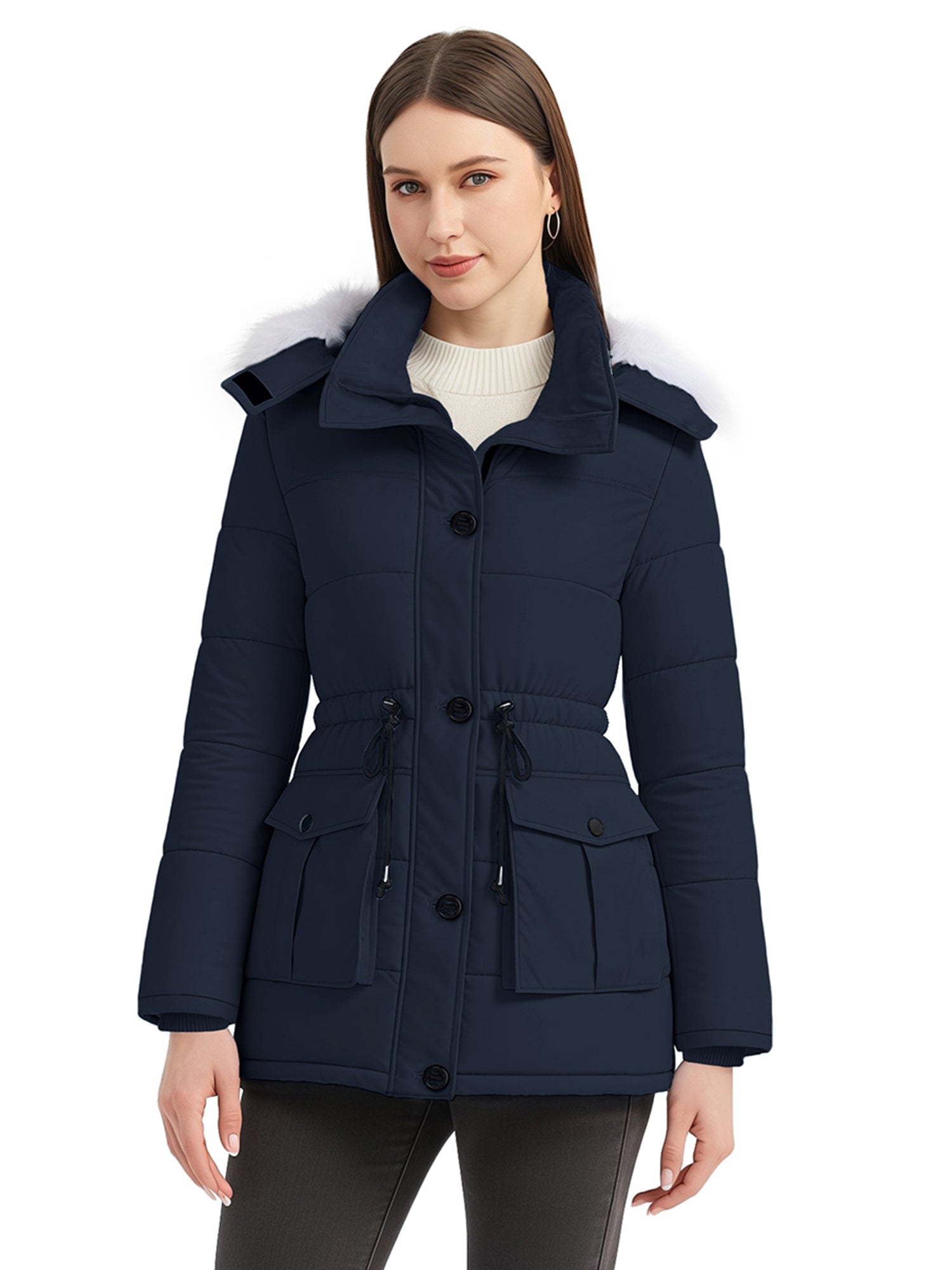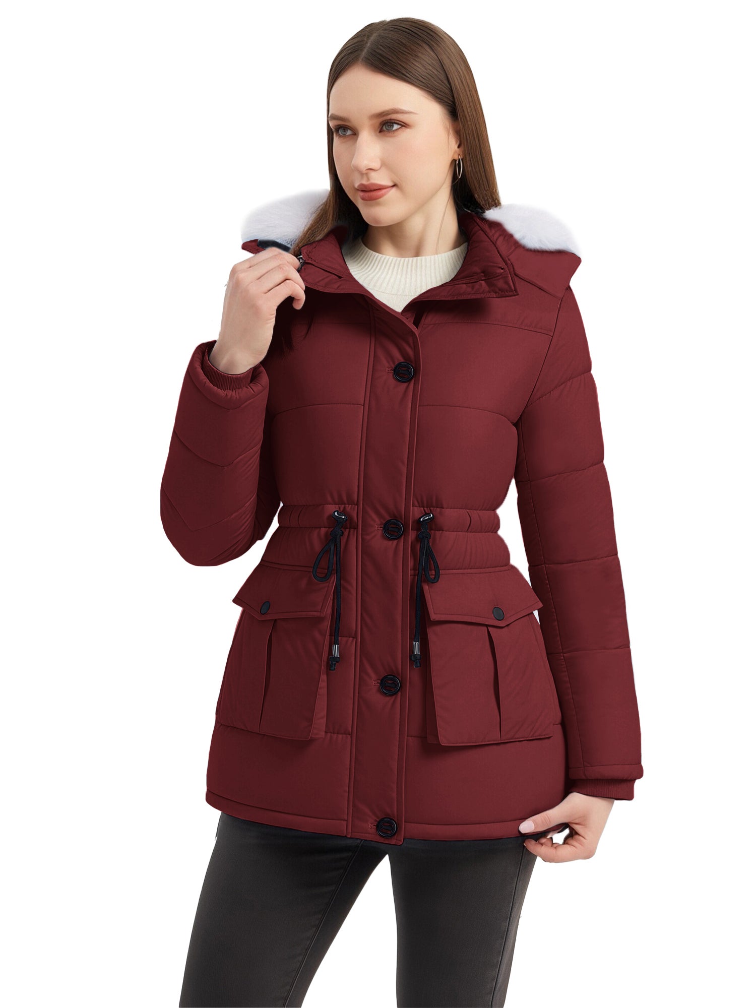 Stylish Choices: Featuring a waist drawstring, this parka jacket for women allows for flexible adjustment of the fit, creating a flattering appearance. Besides, this women's winter parka coat is equipped with a high collar.