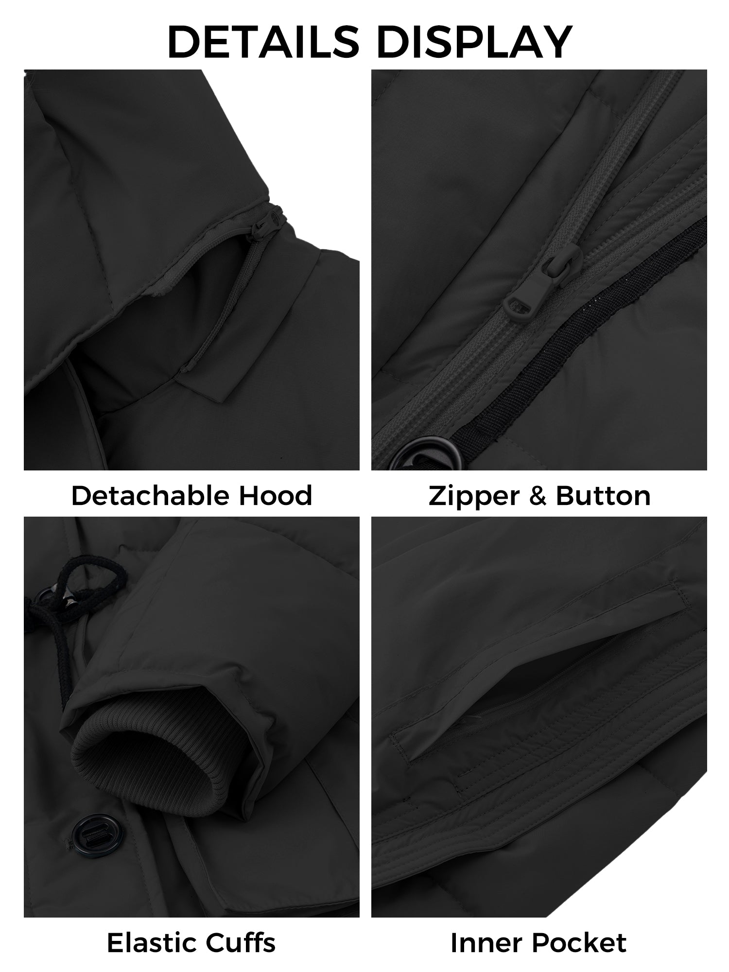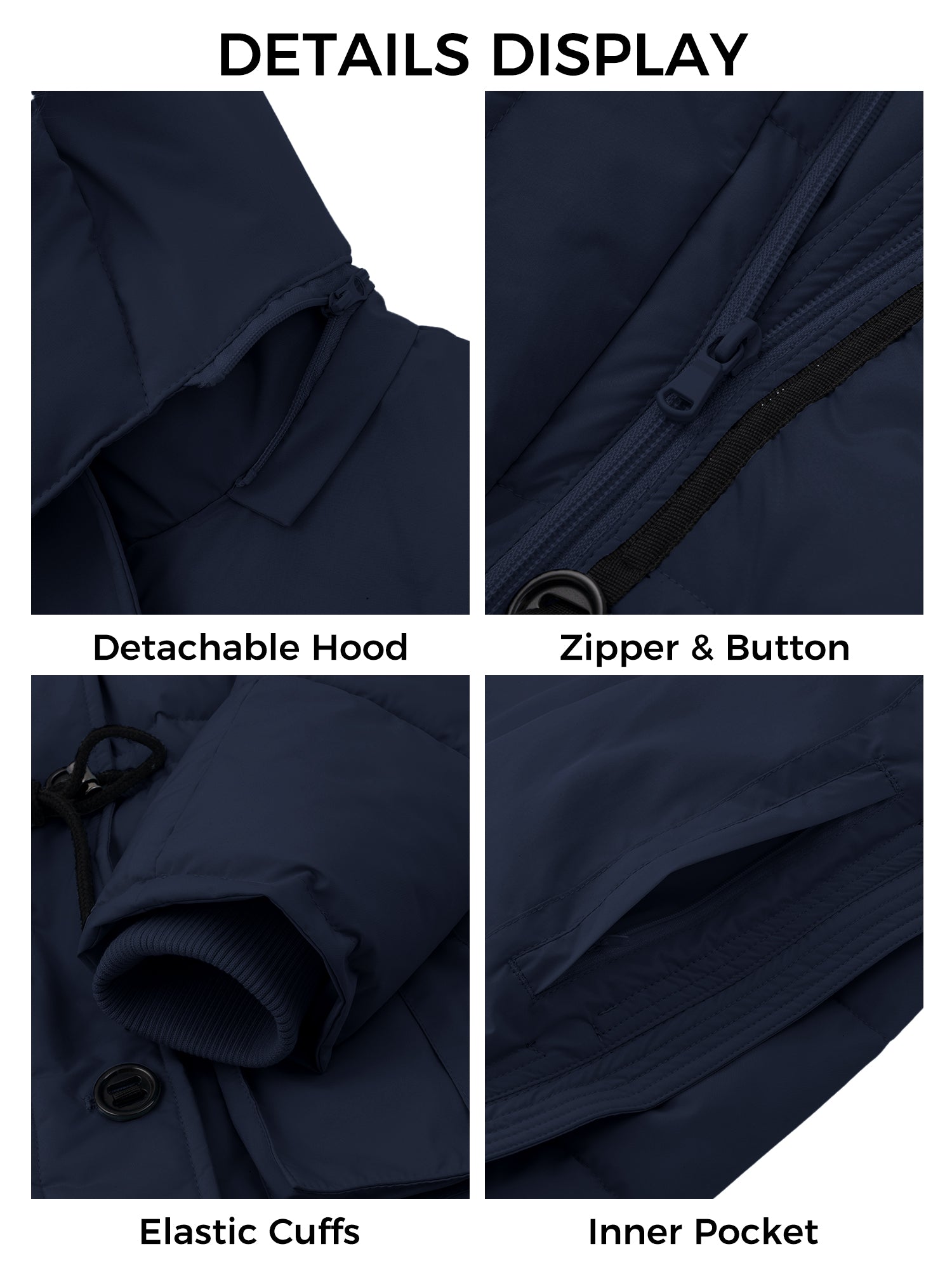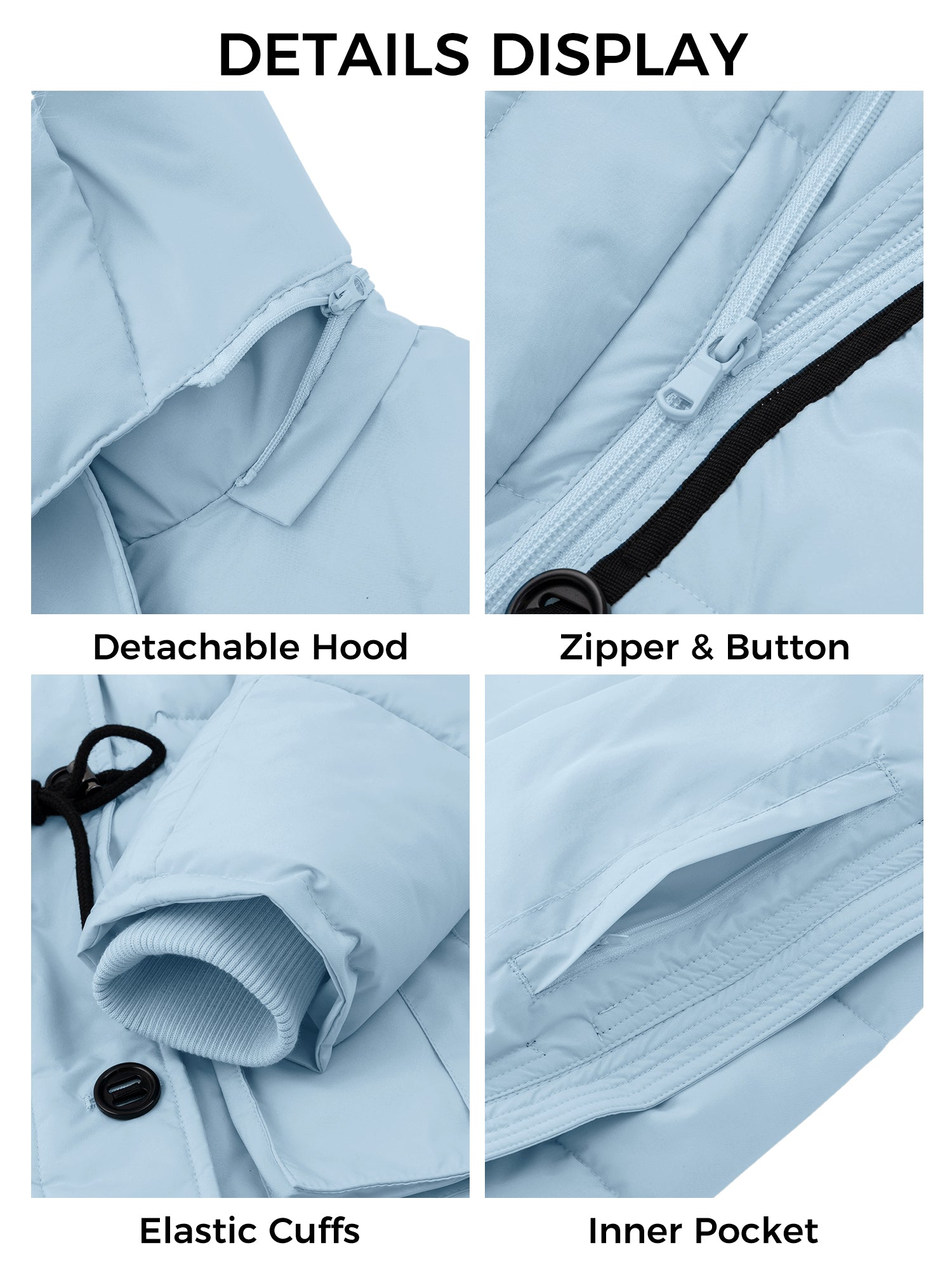 Windproof Designs: This hooded jacket for women comes with adhesive earmuffs. And this women's puffer coat combines placket a two-way zipper and front button. Plus, the elastic ribbed cuffs on the women’s jacket is designed to provide a cosy fit.